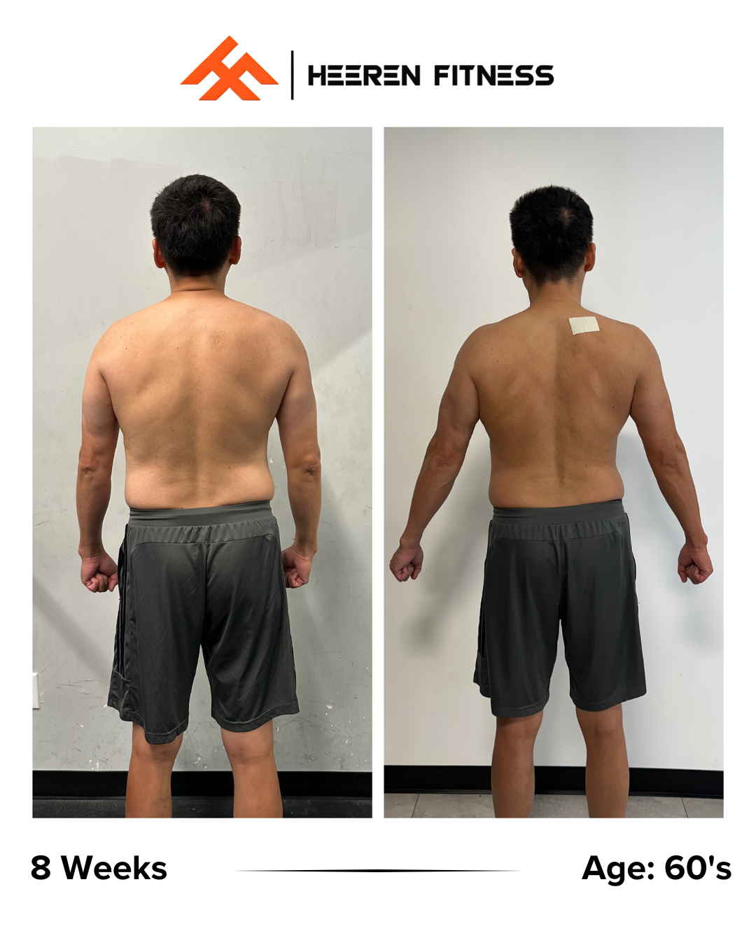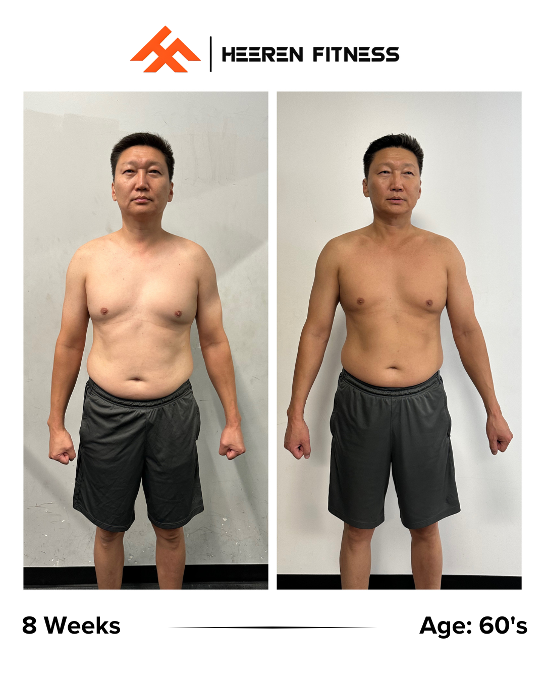 Before and after body transformation of a man in his 60s at Heeren Fitness over 8 weeks, showcasing improved physique.